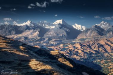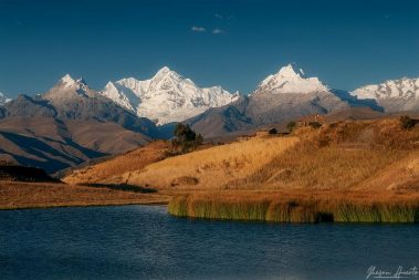 rodeadas de árboles de quenual. Para el atardecer subiremos a uno de los miradores para fotografiar a las montañas más altas del Perú durante la hora dorada y hora azul. Entre las montañas que destacan están: El Huascarán (6768 mts.), El Huandoy (6395 mts.), El Chopicalqui (6354 mts.), El Chacraraju (6110 mts.), entre otros.