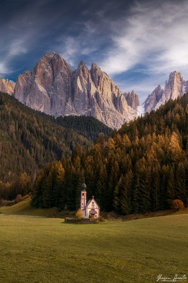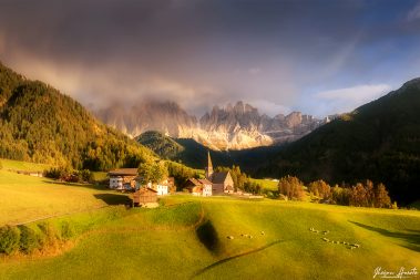 Para el atardecer visitaremos el Val di Funes y sus iglesias características que nos regalarán una de las mejores postales del viaje.