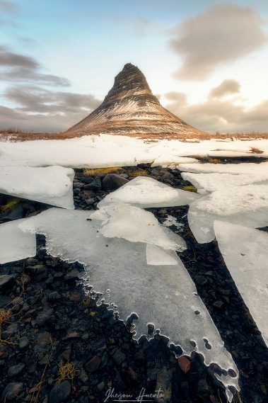 Esta montaña es también conocida como » La Montaña de Batman» por sus picos irregulares, pareciéndose al logo del superhéroe icónico. Su primer plano está lleno de composiciones, desde ondulantes dunas de arena negra entre la nieve, hasta cultivos de hierba y charcos helados.