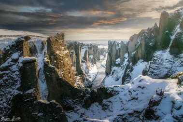 Entraremos en la Reserva Natural de Skaftafell, famosa por sus bellos paisajes . Aquí, podrás fotografiar lenguas de glaciares, lagunas, los picos de majestuosas montañas nevadas, cascadas congeladas y ríos que fluyen desde los glaciares. Visitaremos el famoso Cañón de Fjaðrárgljúfur. Este cañón es famoso por su belleza y sus impresionantes paredes de roca, que le valieron numerosas apariciones en películas y videoclips. Pasaremos por la ciudad de Vik para fotografiar algunos spots antes de esperar el atardecer dentro de una cascada épica.