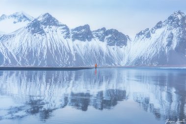 Dependiendo de la marea, podemos ser capaces de fotografiar el reflejo de Vestrahorn sobre la playa negra. Seguiremos fotografiando el
