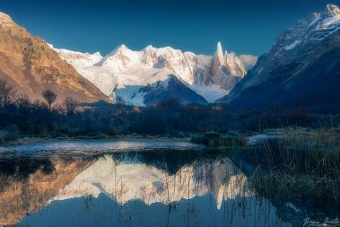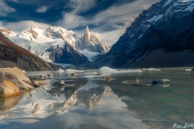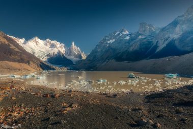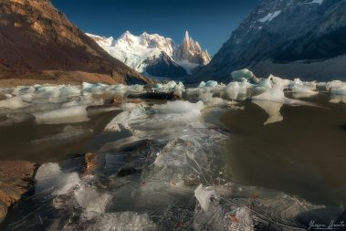 Despertaremos muy temprano en la mañana para realizar nuestro primer trekking que nos llevará hacia la hermosa Laguna Torre, bajo los pies del Cerro Torre. En el recorrido tendremos oportunidad de fotografiar los coloridos bosques patagónicos con los clásicos colores de otoño que será un espectáculo para nuestros ojos. Caminaremos 18 kilómetros en total pero el esfuerzo será recompensado con la llegada a la Laguna Torre y sus témpanos de hielo que nos regalarán fotografías únicas.